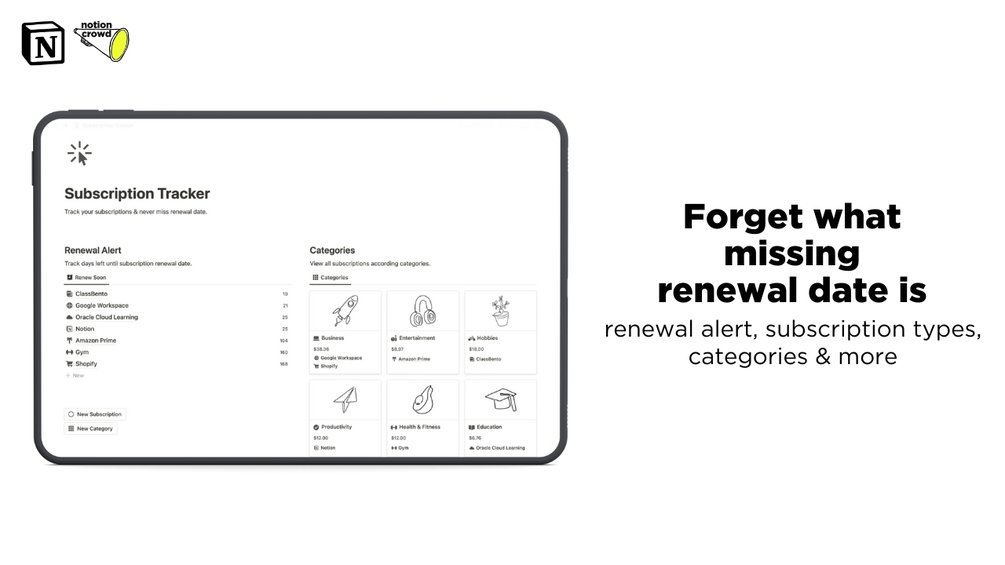 Effortlessly manage your recurring expenses with Notion Subscription Tracker. Keep track of subscriptions, set renewal reminders, and gain valuable insights into your spending habits all in one centralized platform.